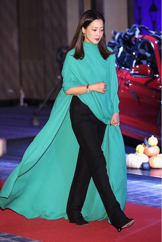如果你想要给人眼前一亮的感觉,那么衣服的颜色和款式都可以做出一些改变,从而提升你的亮点。作为韩国女神的金喜善这次出席活动的穿搭就很有亮点,一身绿色连衣裙搭配了黑色锥形裤,时髦的混搭能够帮助她营造出独特的魅力,而且也显得非常有气质。